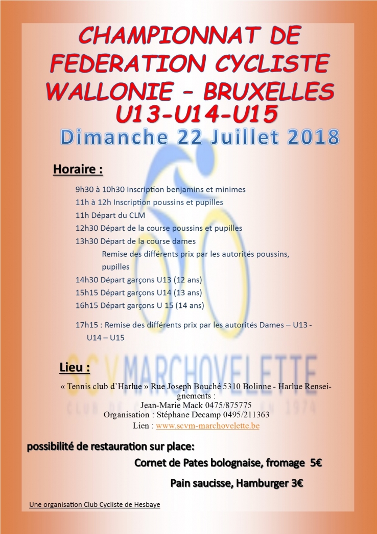 CHAMPIONNAT DE FEDERATION CYCLISTE WALLONIE – BRUXELLES U13 - U14 - U15